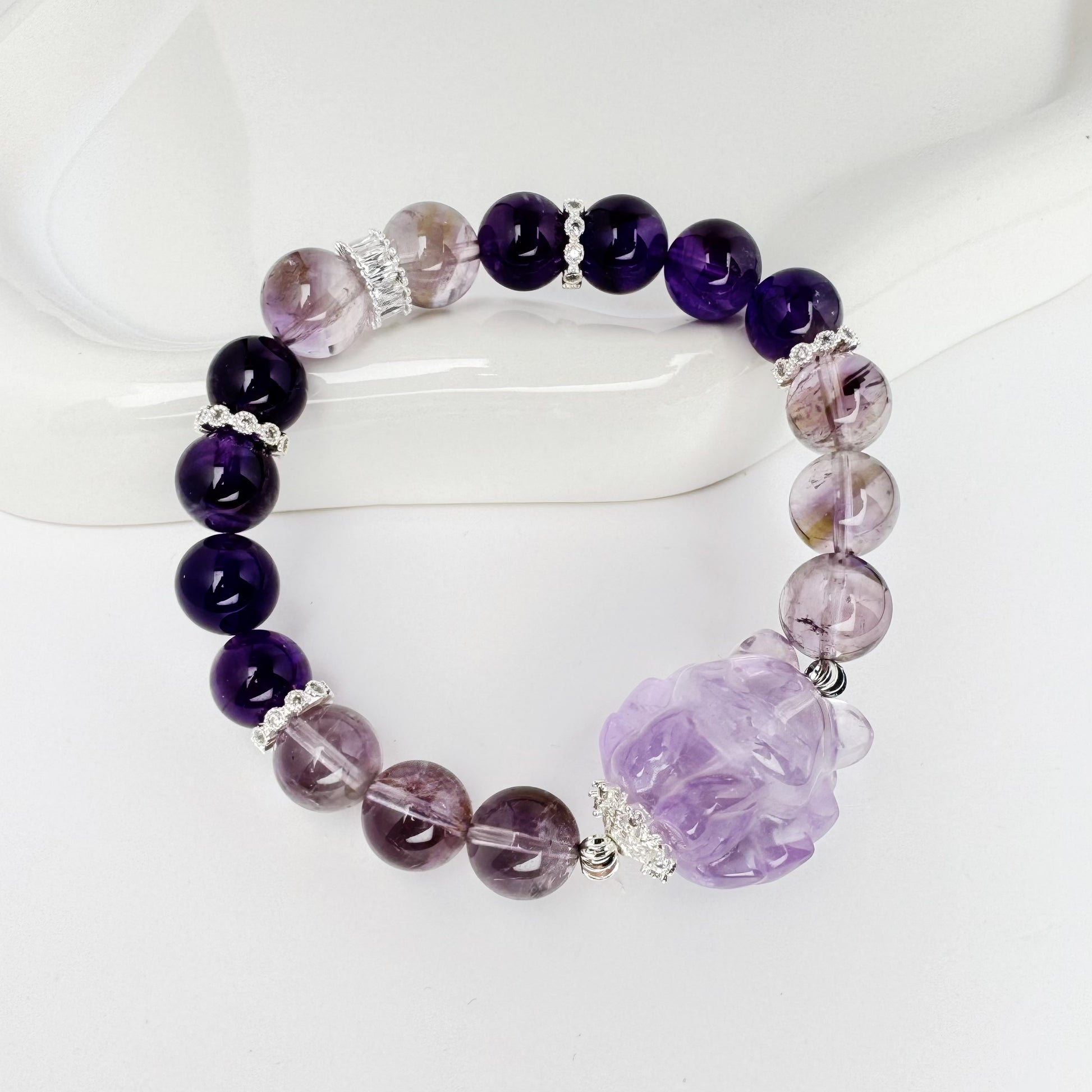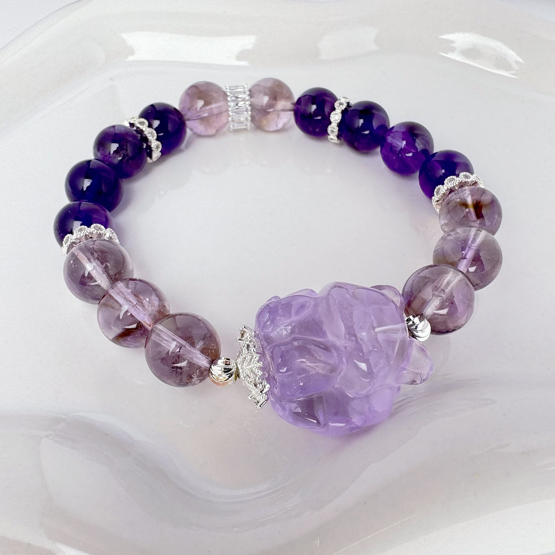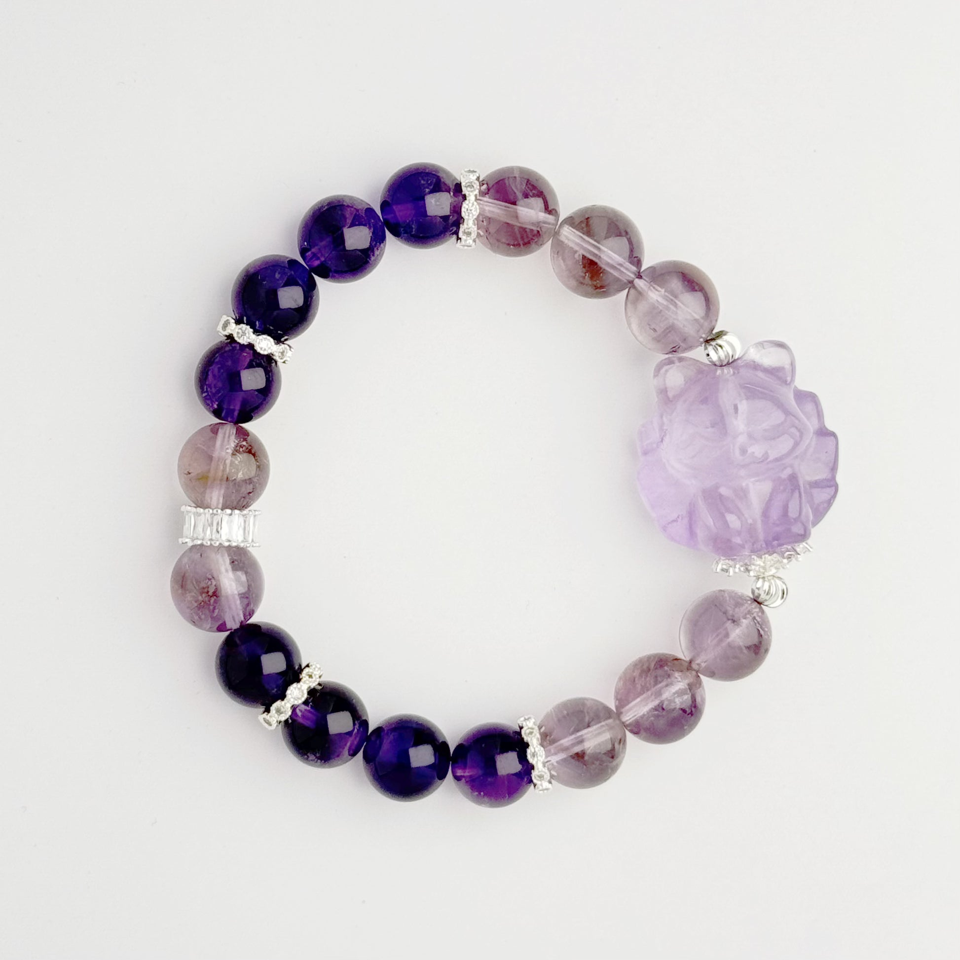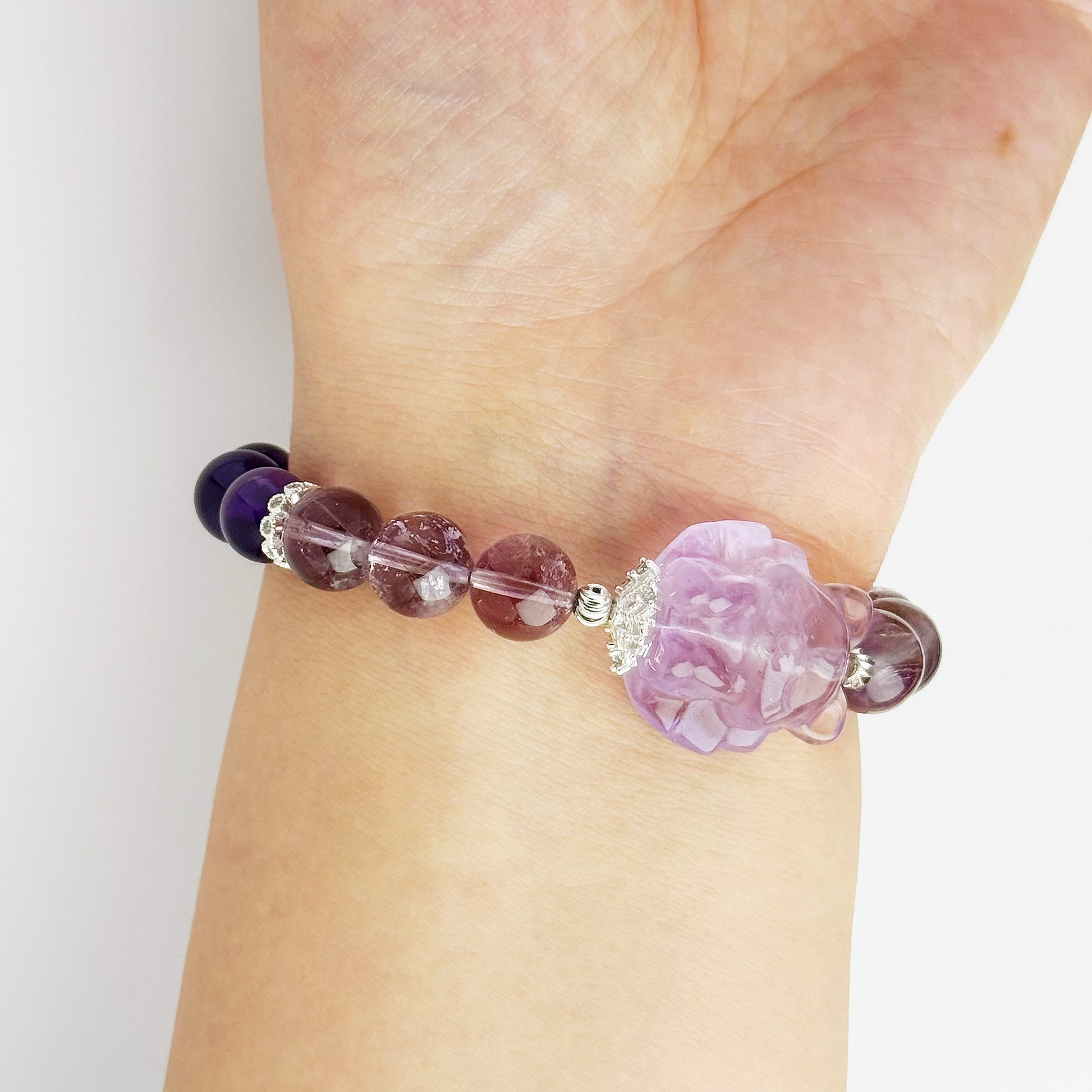 Introducing our Enchanting Amethyst Fox Bracelet! This unique piece features stunning fox-shaped amethyst beads, each one a work of art with its own natural variations in color. The amethyst beads range from rich purples to lighter shades, adding a touch of whimsy and charm.Amethyst is renowned for its calming and protective properties, making this bracelet not just a fashion statement but a wearable talisman of peace and well-being. Whether you're seeking to balance your crown chakra or simply add a touch of elegance to your day, this bracelet is the perfect choice.Crafted with care, the combination of the fox-shaped beads and the varying colors of amethyst creates a piece that shines with both beauty and energy. Treat yourself or gift it to someone special for a touch of magic and a dose of positive vibes.