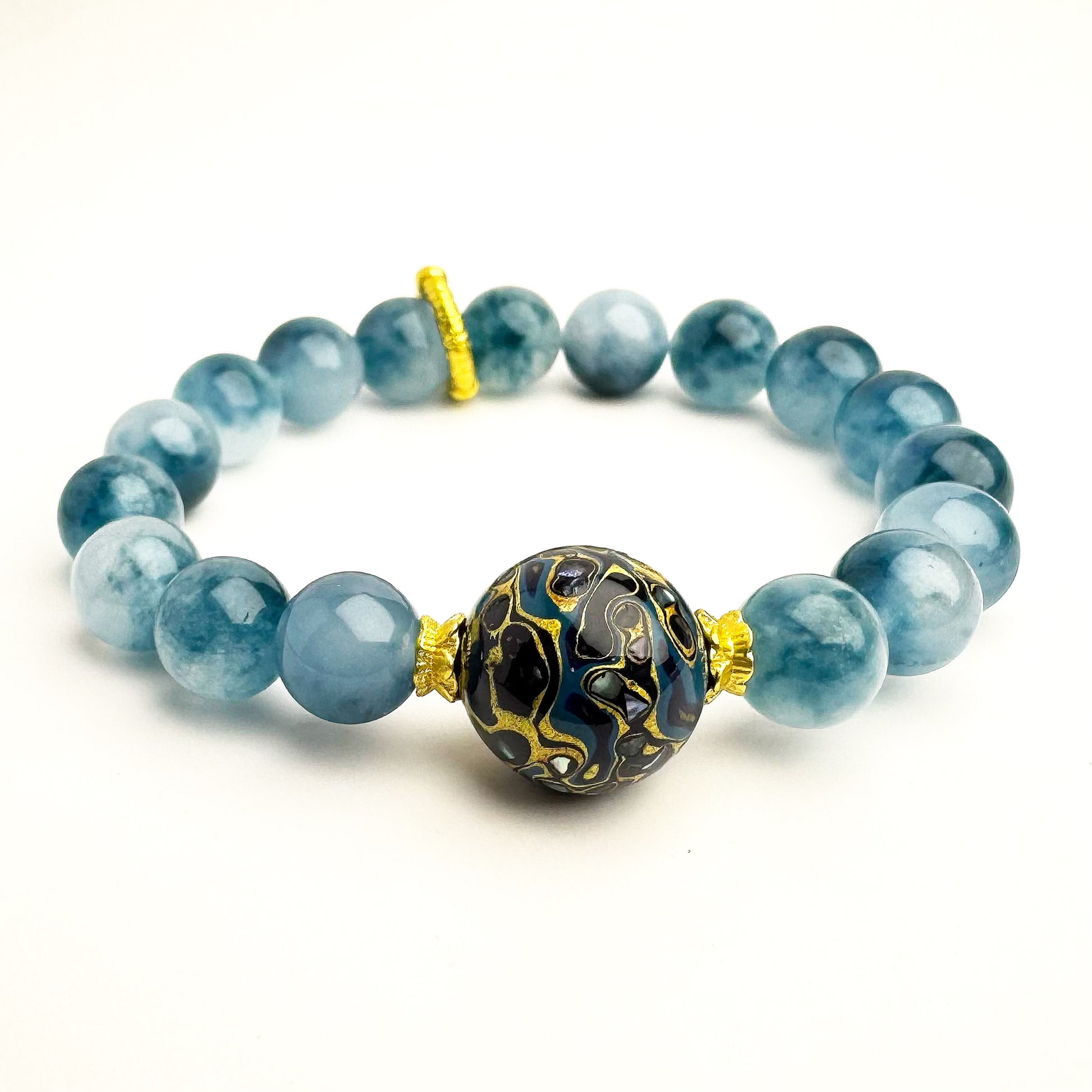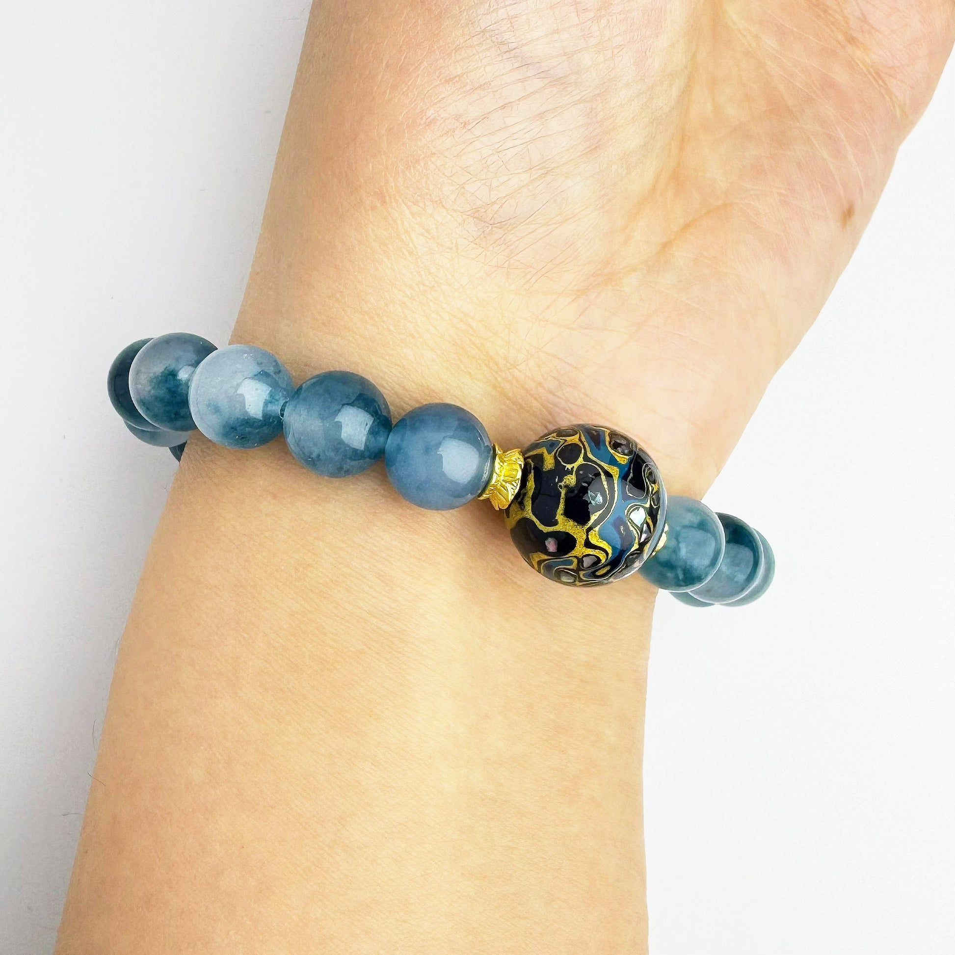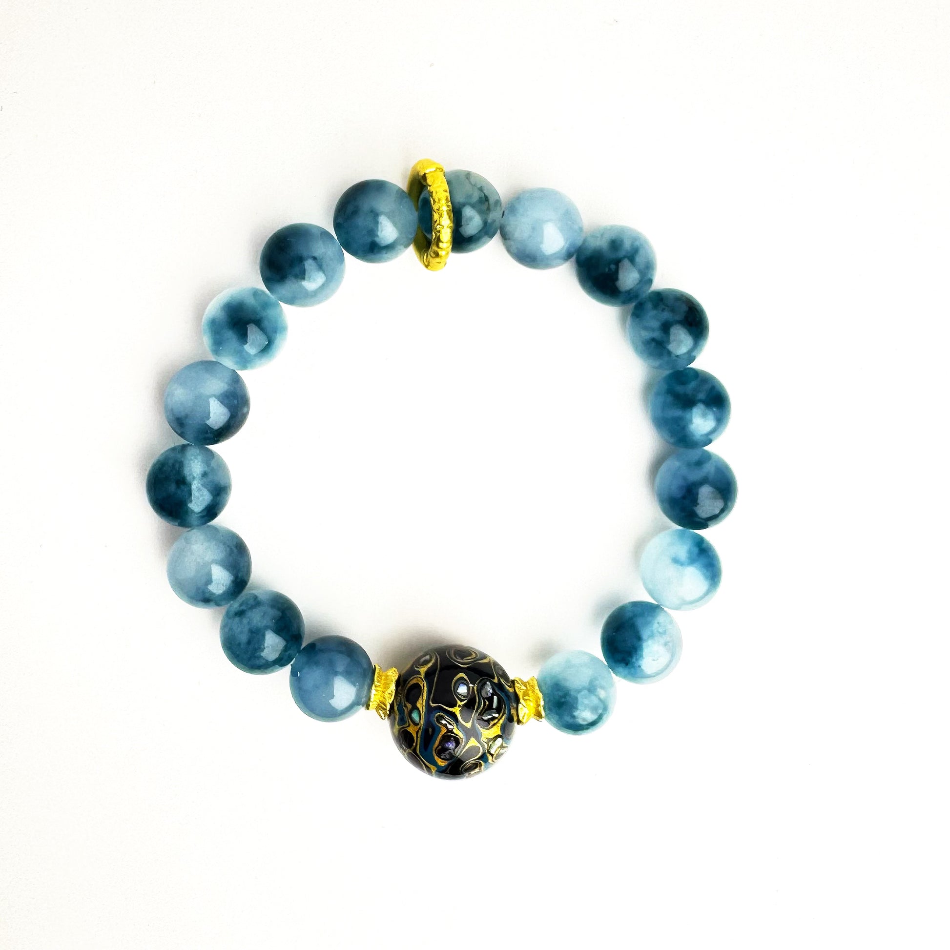 Blue Jade Bracelet with Chinese Lacquer Bead and Gold
