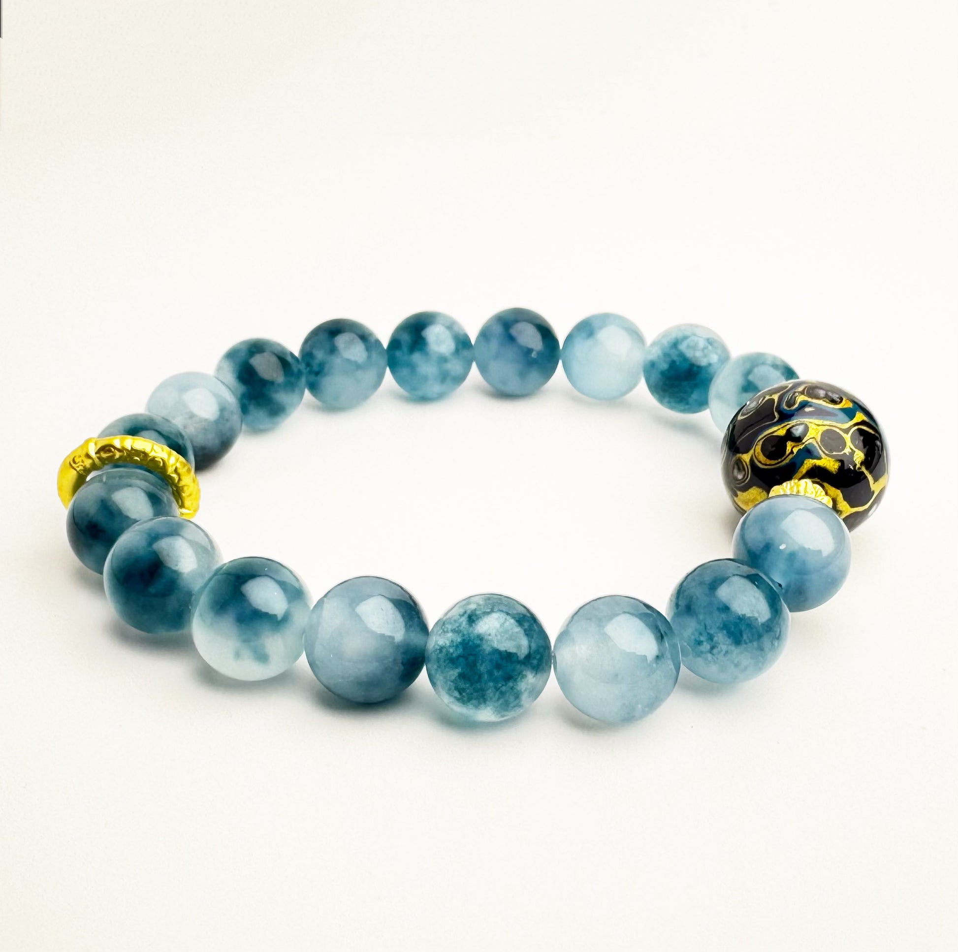 Discover the timeless elegance of our Blue Jade Bracelet with Chinese Lacquer Beads and Gold! This exquisite piece features rich blue jade beads, each one a gem of nature, paired with unique Chinese lacquer beads that blend dark blue and gold patterns. The intricate design of these beads adds a touch of cultural heritage and sophistication.The combination of blue and gold creates a harmonious and luxurious aesthetic, perfect for those who appreciate both tranquility and opulence. Whether you’re dressing up for a special occasion or adding a touch of elegance to your everyday look, this bracelet is a statement piece that exudes luxury and grace. Treat yourself or gift it to someone special and let the beauty of this bracelet shine on your wrist.