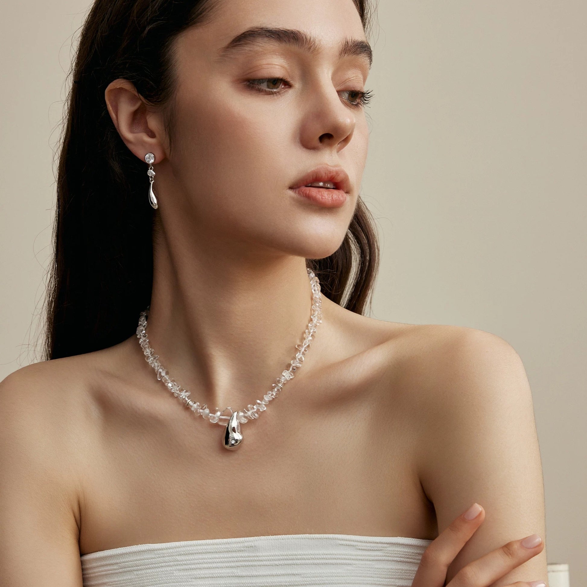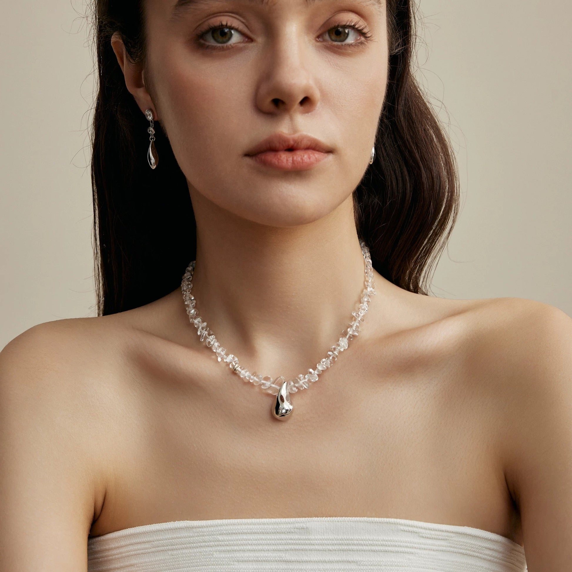 A modern masterpiece, this chunky necklace features raw white crystals in a water drop shape. It's the perfect statement piece for any occasion, adding a touch of chic to your look. Bold yet elegant, it's the epitome of contemporary style.