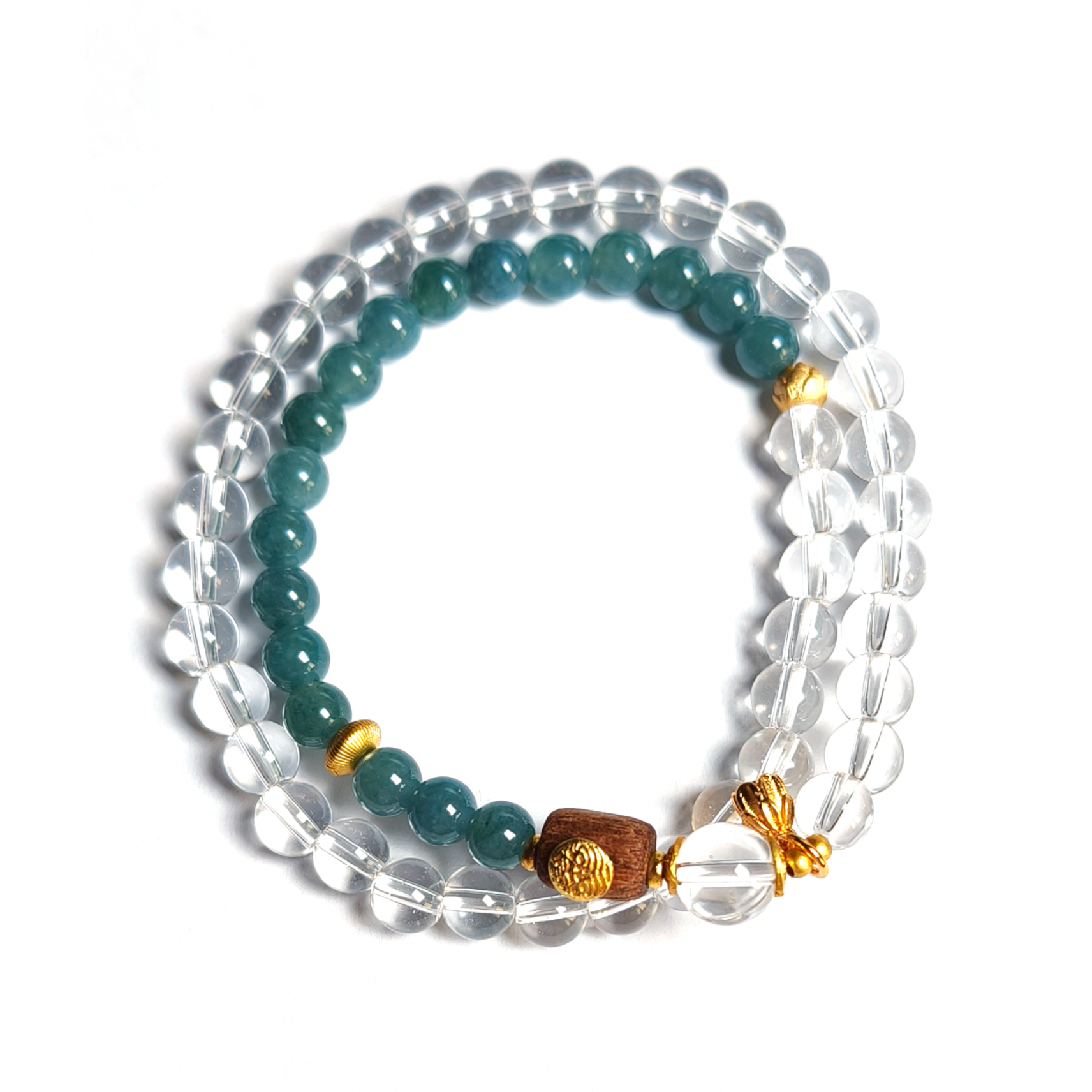 White crystal, or clear quartz, is a stone of light, amplifying positive energy and dispelling negativity. It is known to enhance clarity of thought and spiritual communication, making it a stone of purity and focus. Blue water jadeite, with its calming hues, is believed to attract prosperity and success, promoting emotional healing and balance. Together, these stones create a bracelet that not only adorns the wrist but also harmonizes the mind and spirit.